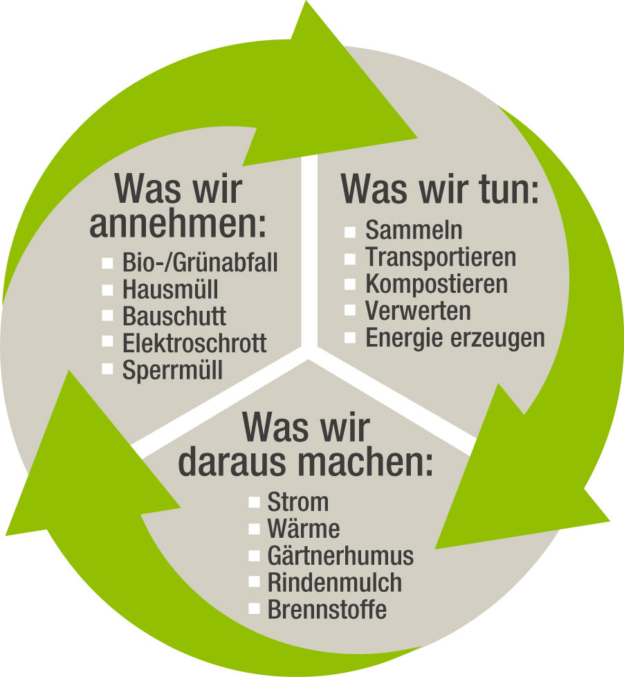3 Pfeile deuten einen Kreislauf an. Text informiert darüber, was die EMiL annimmt (verschiedene Abfallarten), wie die EMiL Abfälle verarbeitet und was die EMiL aus Abfällen produziert (z.B. Energie, Humusprodukte)